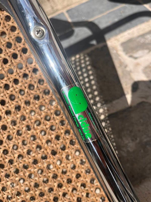 Bref, ici c’est une fabrication haut de gamme italienne de l’éditeur Cidue. Par chance adhésifs présents sous le tube chromé des deux assises.